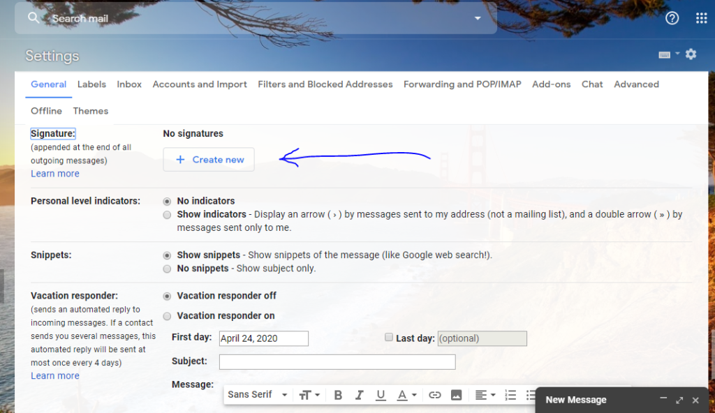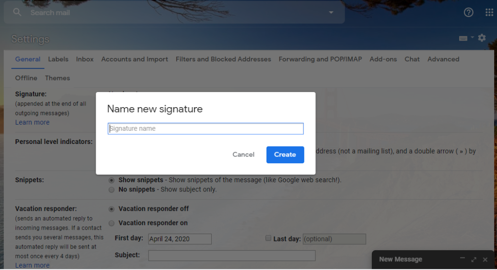 Gmail prompts us to add/create New Signature in General settings page – “Create New” with Plus icon.